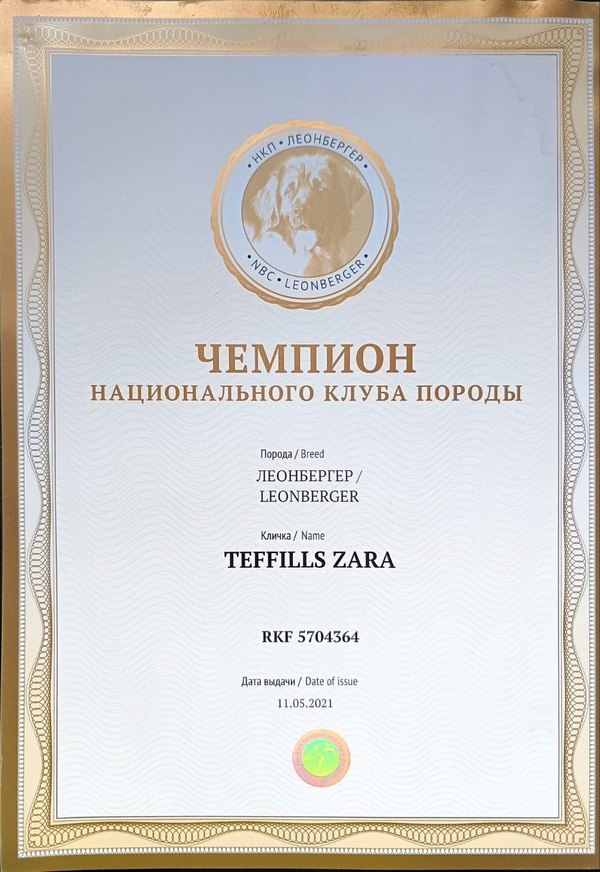 Зара – потрясающая представительница породы леонбергер, прекрасно осознающая собственную уникальность. Эта сильная и элегантная красавица буквально светится изнутри, поражая зрителей своим величественным видом и неподражаемым шармом на каждом ринге.